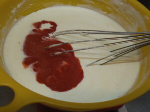 たっぷり混ぜ込んで、綺麗なピンク色のレアチーズケーキにします。