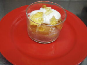 梅酒のサヴァランは、オーダー頂いてから生クリームと梅酒のゼリーを乗せて仕上げています。ジュワジュワに梅酒のシロップがしみ込んだブリオッシュは、爽やかで初夏にぴったりです。