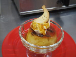 バナナとラムレーズンのプリンにコーヒークリーム添えです。ラムレーズンのほろ苦いコーヒークリームが良く合います。