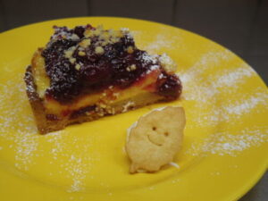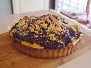 チェリーとカスタードの焼きタルト、たっぷりのアメリカンチェリーのコンポートがカスタードの上に乗ってます。このタイプのタルトは、青りんご、苺で作ってきましたが(あとたまにルバーブ)、チェリーも美味しいです。