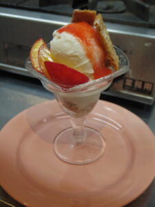 パフェは底にクランブル、自家製ココナッツアイス、カットしたすもも、すもものソース、横にココナッツのチュイールを添えてます。ココナッツアイスの丸い甘さとすももの甘酸っぱさが良く合います。明日も10時~18時までお待ちしています!