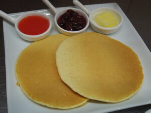 フルーツソース2種&バターは、今週はすももとチェリー。すももはパフェに使ってるソースと同じで裏ごししてあります。チェリーはゴロゴロと粒が残ったソースです。