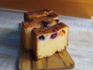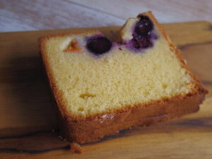 あんずとブルーベリーのパンドジェーヌ。最初にアーモンド粉と砂糖と卵白を練ってローマジパンを作るところから作り始めるお菓子です。小麦粉よりもアーモンドの粉の方がずっとたくさん入るリッチなお菓子です、常温で販売してますが、冷蔵庫でキンキンに冷やして食べるのがお勧め。