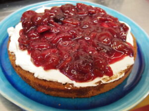 フォレノワールは、ココアスポンジにたっぷりキルシュのシロップを打って、さっと煮たアメリカンチェリーと生クリームをサンドしました。