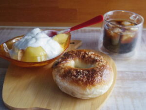 ベーグルとベイク月のメイプルソルトバターベーグル、キウイ桃ヨーグルト。