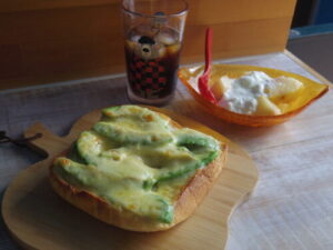 ボンボランテの角食でアボカドチーズトースト、桃ヨーグルト。