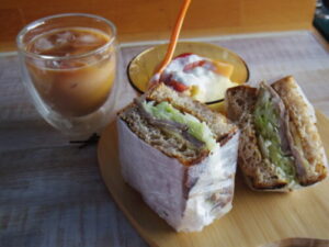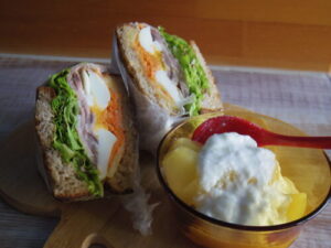 kursのルヴァンでキャベツと自家製ハムとチーズのトーストサンド、ネクタリンヨーグルト。