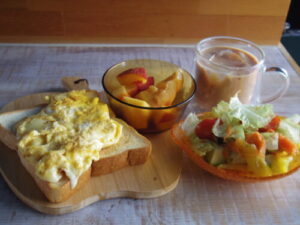 丹青の食パンでチーズオムレツトースト、サラダ、ネクタリンヨーグルト。カフェのお菓子で余った卵白1個分と小さめの卵1個を使ってチーズと一緒に焼いたオムレツを、バタートーストに乗せただけだけど、美味しいー。