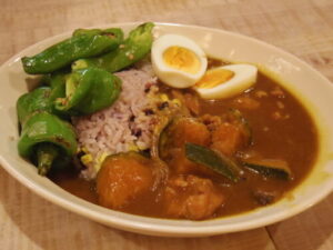 チキンかぼちゃカレーに万願寺と茹で卵トッピング。