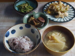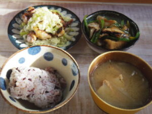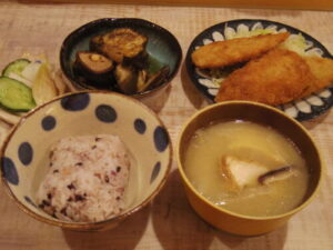 雑穀ご飯、アジフライ、加茂茄子と椎茸の揚げ浸し、浅漬け、みそ汁。