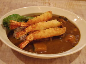 チキンかぼちゃカレーにエビフライと万願寺トッピング。