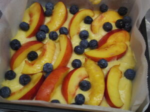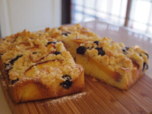 トレイベイクはネクタリンとブルーベリー。アーモンド粉入りのケーキ生地の上にたっぷりネクタリンとブルーベリーを乗せて、クランブルを散らして焼きます。ケーキ生地に対して果物の割合が多いのがトレイベイクの美味しいところと思います。