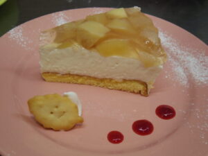 桃のレアチーズケーキは、スポンジ台にレアチーズケーキ、桃のコンポートとゼリーを乗せてます。