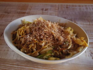 焼きそば。具は豚バラ、キャベツ、椎茸、しめじ。