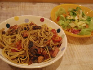 ベーコンとマッシュルームとプチトマトのスパゲティ、サラダ。