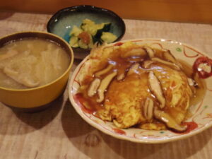 カニカマ天津飯、梅きゅうり漬け、みそ汁。ほぼカニのカニカマ、良い出汁も出る上、冷凍出来るので、値段が張っても買い置きを欠かさない。