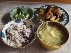 黒米ご飯、鶏と夏野菜の黒酢炒め、梅きゅうり漬け、みそ汁。