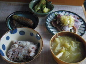 雑穀ご飯、カツオのタタキとネギ塩だれ、茄子の煮びたし、梅きゅうり、みそ汁。