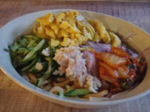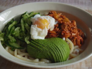 ぶっかけうどん。具は、キュウリ、韓国の辛いツナ缶、アボカド、温泉卵。ツナ缶はコスストアで買ったのだけど、ハングル読めないとパッケージの写真だけを頼りに買うので、中にミックスベジタブルが入っててちょっとビックリした。