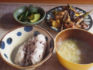 黒米ご飯、鶏と夏野菜の甘酢炒め、梅きゅうり、みそ汁。