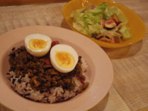 雑穀ご飯でドライカレー、サラダ。ボロネーゼにパウダー状のカレー粉を加えてドライカレー。