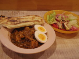 チキンとマッシュルームのカレー、手作りナン、サラダ。作り置きの茹で卵を添えてみると、ちょっと豪華に。