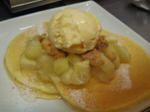 パンケーキのアップルクランブルは、ブラムリーの温かいコンポートとクランブル、自家製バニラアイスを載せました。イギリスのデザート、アップルクランブルをパンケーキの上にドンっと乗せてみました。サクサクのクランブルとパンケーキは、ちょっと面白い組み合わせだな、と初登場です。