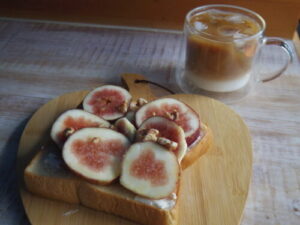 ボンボランテの角食でいちじくトースト。クリームチーズを塗ったトーストにスライスしたイチジク、ローストクルミを乗せてから蜂蜜をタラっと。
