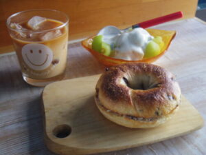 ベーグルとベイク月のチョコチップベーグルでクリームチーズサンド、シャインマスカット桃ヨーグルト。