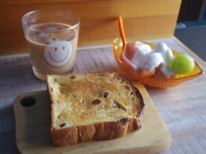 kursのレーズンパンドミのバタートースト、シャインマスカット桃ヨーグルト。