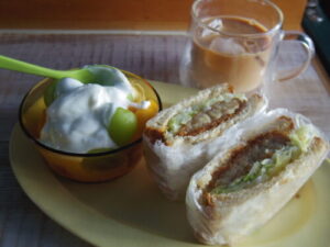 kursのパンドミでコロッケキャベツサンド、シャインマスカット桃ヨーグルト。