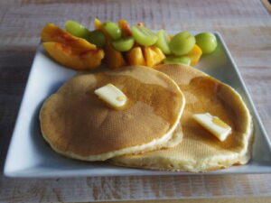 メイプルシロップとバターのパンケーキに黄金桃とシャインマスカット。