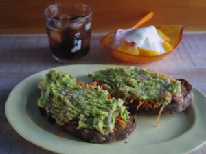 クルミカンパーニュトーストにアボカドペースト、黄金桃ヨーグルト。アボカドペーストの下にはキャロットラぺも敷いて。