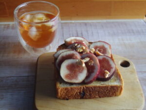 アボカド生ハムチーズトースト、カフェで余ったフィナンシェ、桃いちじくヨーグルト。
