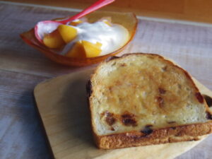 kursのレーズンパンドミでバタートースト、黄金桃ヨーグルト。