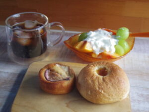 kursのレーズンパンドミでバタートースト、黄金桃シャインマスカットヨーグルト。