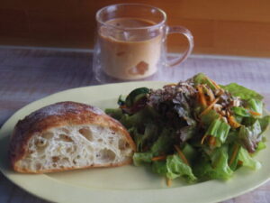 丹青のマカダミアナッツとハーブチーズのチャバタ、サラダ。