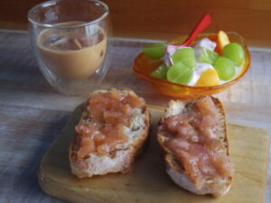 カンパーニュでジャムトースト、黄金桃シャインマスカットヨーグルト。