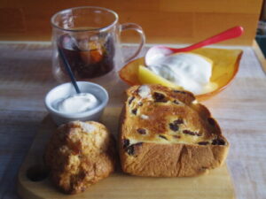 天狗堂のレーズンブレッドでバタートースト、カフェで残ったスコーン、キウイヨーグルト。