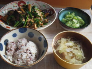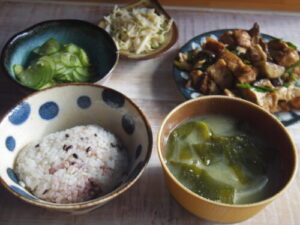 雑穀ご飯、豚バラと厚揚げと野菜の中華炒め、キュウリの酢の物、みそ汁。炒め物の野菜は、ニラ、椎茸、しめじ、茄子、ネギで、味付けは甜麺醤とオイスターソース。