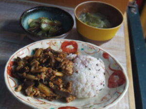 雑穀ご飯、茄子とひき肉の味噌炒め、キュウリとキクラゲの酢の物、みそ汁。
