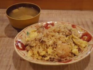 チャーハン、みそ汁。具は、ネギ、エビ、自家製豚バラチャーシュー、卵でご飯はインド米。