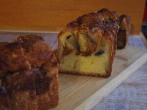 いちじくキャラメルケーキは、マーブルにしたキャラメルケーキ生地とプレーンなパウンドケーキ生地に城陽産のいちじくをたっぷり乗せてます。朝、めちゃくちゃ暗かったので写真が分かりにくいですが、ゴロゴロと贅沢に入ったイチジクとキャラメルのほろ苦さが良く合います。