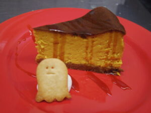パンプキンベイクドチーズケーキは、断面がホントに綺麗なオレンジ色で嬉しくなります。ハロウィン仕様のクッキーも今日からです。キャラメルソースをかけてお出ししています。