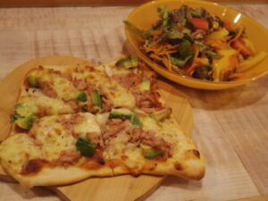 ピザ、サラダ。薄めのピザ生地、久々に自作。トッピングはアボカドとツナと玉ねぎ。