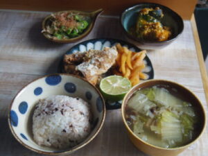 雑穀ご飯、サンマ竜田揚げ、大根の和え物、茹でオクラに鰹節と醤油かけたの、かぼちゃそぼろ煮、白菜と鶏団子のスープ。