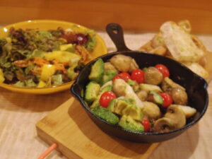 アヒージョ、サラダ、色々パンの端っこ。アヒージョの具は、ホタテ、マッシュルーム、プチトマト、アボカド。