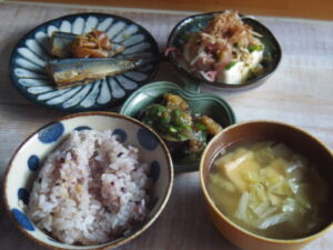 雑穀ご飯、サンマ梅煮、茄子のみぞれ煮、冷奴、みそ汁。