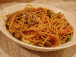 ナポリタン。ナポリタンの下には、チーズオムレツが敷いてある。