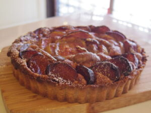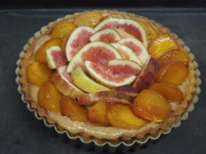 いちじくと柿とシナモンの焼きタルトは、キャラメルソテーして一晩寝かせた柿と、城陽産のいちじくを、シナモン味のアーモンドパウダーの上に乗せて焼きました。柿だけのタルトもいいのですが、今年ラストかなーっというイチジクが手に入ったので、合わせてみました。